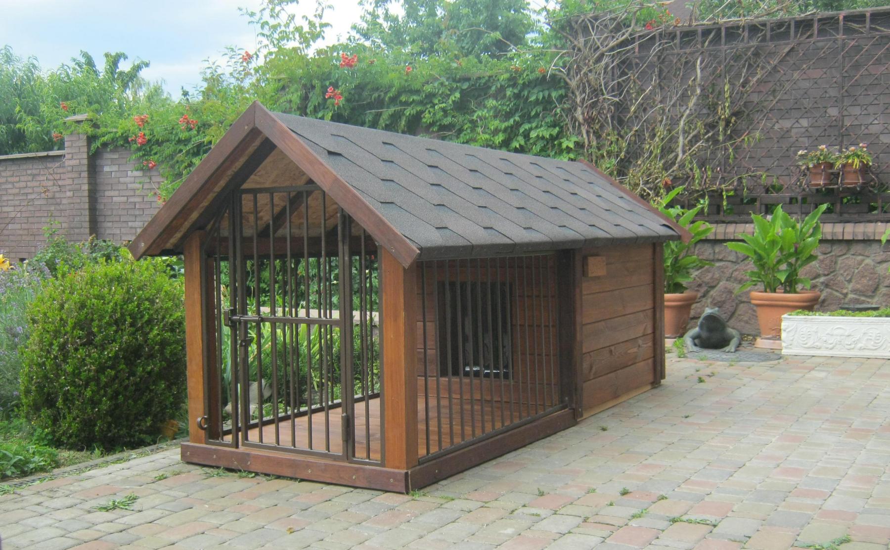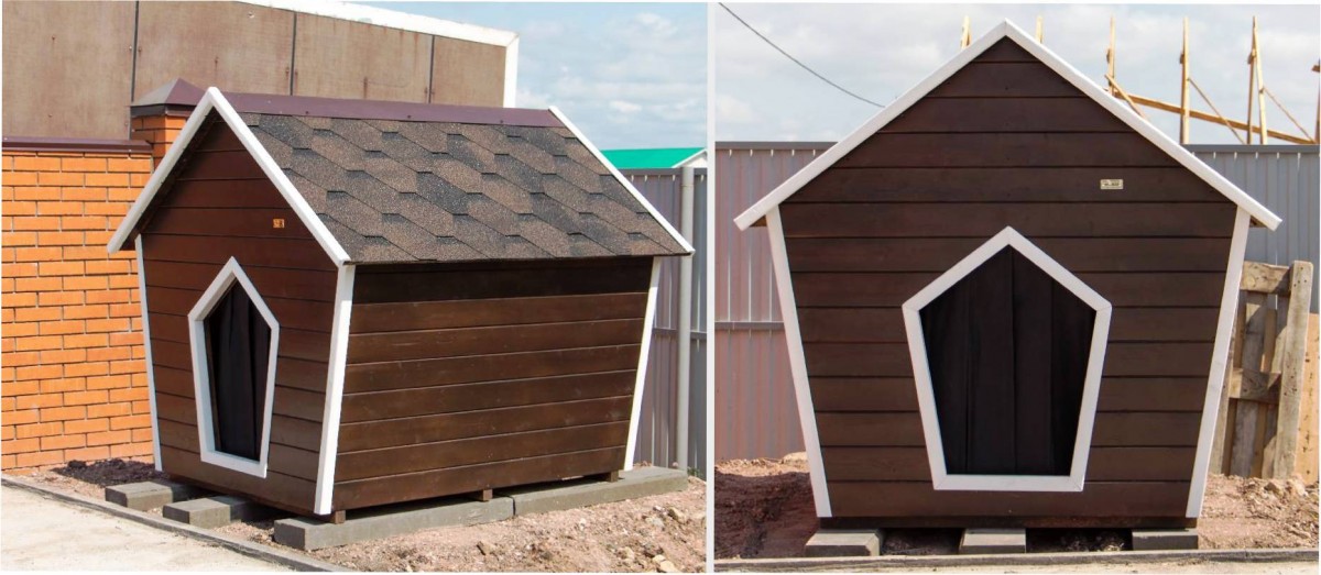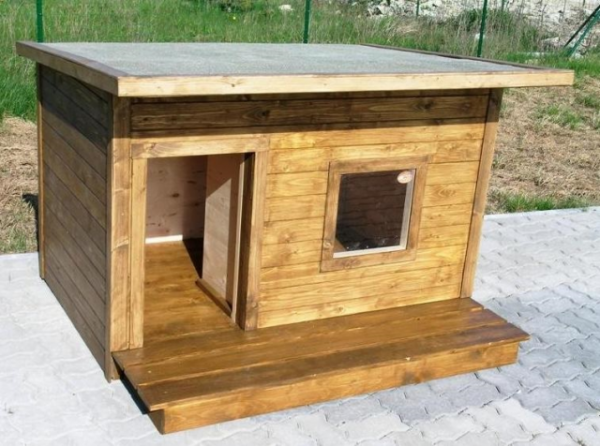Le toit d'un tel bâtiment est rendu commun pour le chenil et le vestibule, ou une configuration complexe est aménagée pour chaque pièce séparément. La taille du porche couvert dépend de la taille de l'animal, il est décoré en accord avec le paysage du site.
