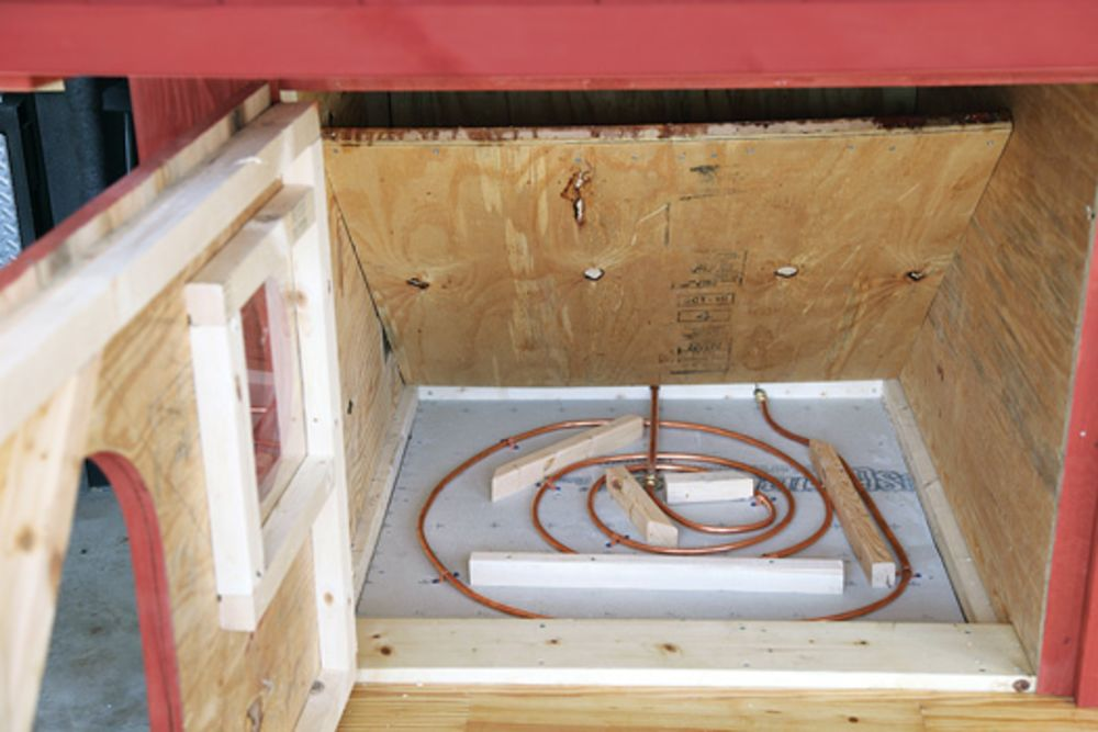 Si le propriétaire n'aime pas le toit en pente visuelle, un plafond ourlé est réalisé pour conserver la chaleur et un toit esthétiquement acceptable est aménagé sur le dessus. Le toit plat peut être facilement rendu amovible pour faciliter le nettoyage ou le traitement des puces dans le chenil.