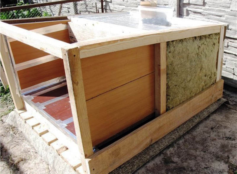 Au fond, sous le fond, une couche de matériau de toiture, fibre de verre, polyéthylène est posée pour réduire l'influence de l'humidité du sol. Il est placé sur une surface inclinée pour éviter la stagnation de l'humidité due à la pluie et à la neige soufflée.
