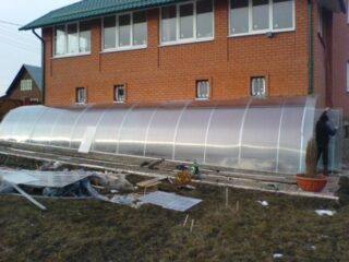 Les poutres en bois sont préparées à partir des matériaux de fondation ou du cerclage de la base en colonne. Le bois est placé sur la charpente des murs et des toits. Ils achètent des feuilles de polycarbonate selon le calcul, pour la fixation au mur, ils achètent des ancrages ou des chevilles en plastique avec des vis autotaraudeuses. Le bois est fixé avec des vis autotaraudeuses, des agrafes, des coins en acier sont utilisés.