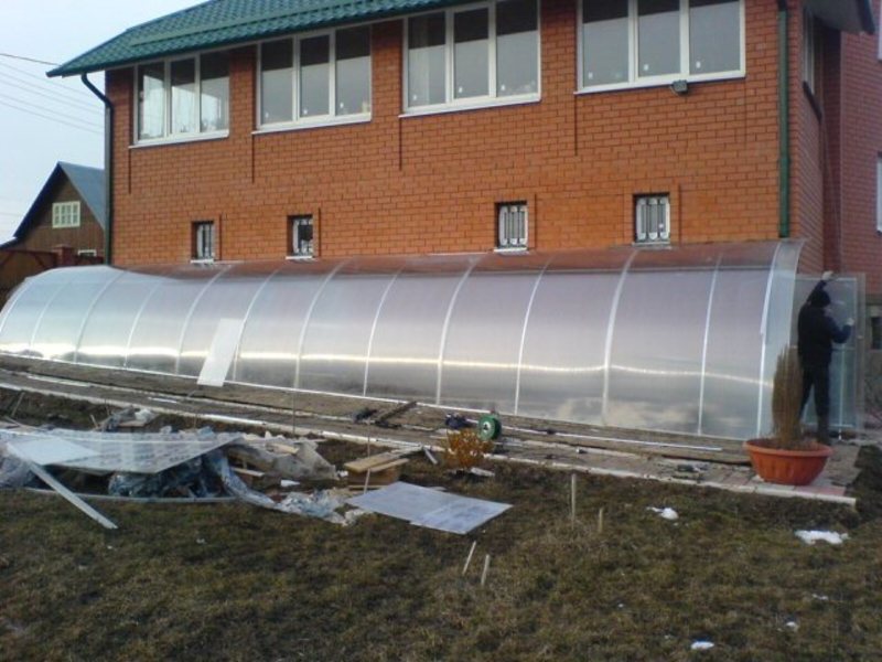 Un toit à une pente est recherché, surtout s'il a un mur mitoyen avec un immeuble résidentiel. La structure est la moitié d'une maison à pignon en polycarbonate. Les rayons du soleil tombent vers l'intérieur à angle droit, par conséquent, ils sont uniformément dispersés et ils agissent efficacement sur les cultures.