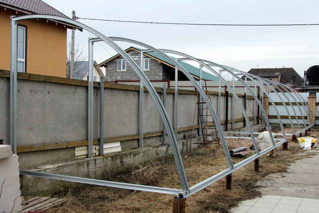 - Semi-arqué. La structure du toit appartient à la catégorie à une pente, mais elle est difficile à fabriquer. Les tuyaux en métal et en plastique doivent être pliés avec une machine, cela ne fonctionnera pas manuellement.