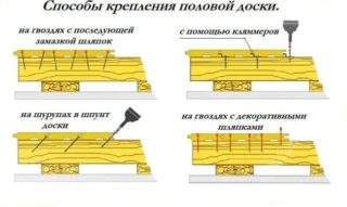 Les clous sont moins chers, leur utilisation est donc justifiée sur de grandes surfaces. Le matériel forme un joint monobloc qui, une fois démonté, entraîne des fissures et la destruction de la carte. Sous charge, le clou se desserre, le sol grince et rebondit. Avec une diminution de l'humidité, le bois sèche, les chapeaux de la quincaillerie deviennent nus.