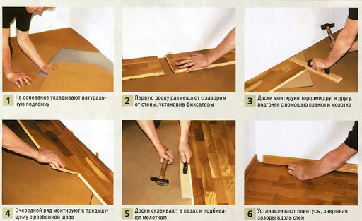 La zone est poncée le long, en travers et en diagonale. Il existe des vernis à base de cire pour réduire l'hygroscopicité. Des plinthes sont bourrées autour du périmètre, des produits en bois ou en plastique sont utilisés.
