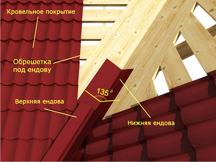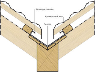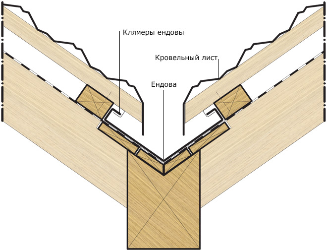 Endova pour les toits en ardoise, les tuiles métalliques sont une pièce qui protège les coins intérieurs de l'eau qui y pénètre. Le dispositif d'une vallée pour un toit en métal est plus compliqué que celui d'une crête: