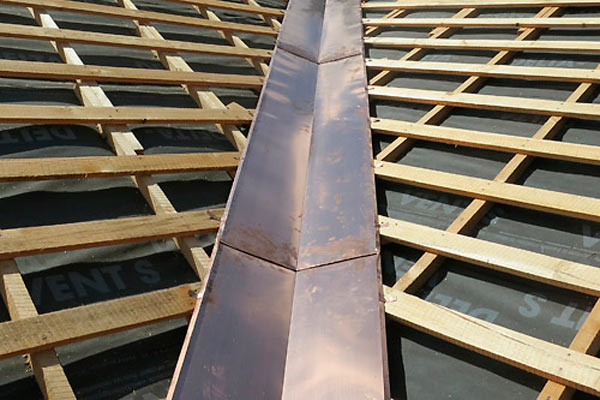 - Une caisse continue est placée le long du bord de la fracture interne. L'angle correspond à l'angle entre les rampes qui se touchent. La valeur de l'angle est déterminée par l'angle de la jonction des pentes. Le lattage empêche le toit de s'affaisser et sert de base solide pour la gouttière, il est donc fait de bois mi-dur.