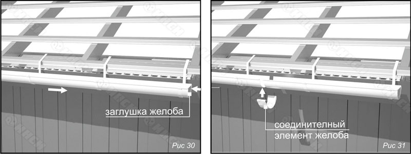- La fixation le long du bord de la dalle est possible si le toit est recouvert d'un matériau rigide, tel que des tuiles céramiques, tesa. De cette façon, des gouttières en plastique sont placées, car elles sont beaucoup plus légères. Des types spéciaux de crochets sont utilisés, qui sont placés sur les pinces.