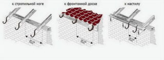 - Long - le crochet est attaché à une longue barre. Un tel modèle est fixé sur les chevrons, une caisse solide. L'installation est effectuée avant le platelage du toit. Vous pouvez fixer les crochets à la planche à rideau.