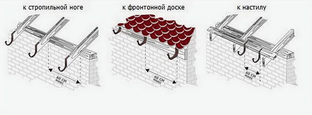 - "Béquilles" comme base - cette option est utilisée s'il n'y a pas de planche frontale, mais il est impossible de la fixer sur la caisse pour une raison quelconque. Ensuite, des "béquilles" en métal ou en bois sont fixées directement au mur et le drain est installé dessus et fixé avec des épingles. Cette méthode est plus souvent utilisée sur les dépendances, car la gouttière n'est pas très esthétique.