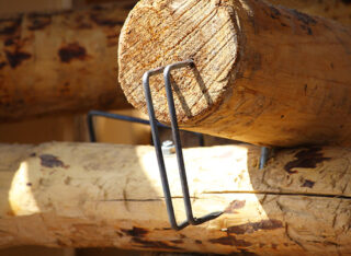 - Les bûches inférieures de la maison en rondins sont fixées avec des agrafes métalliques.
