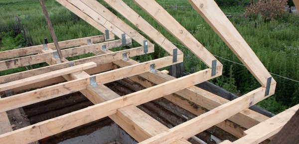 Pour connecter les pieds des chevrons, des plaques de métal pré-préparées, décorées sous la forme de coins, sont utilisées. Les unités les plus chargées sont fixées avec des boulons et toutes les autres sont fixées avec des vis autotaraudeuses. Les clous ne sont nécessaires que pour la fixation temporaire des parties montées de la structure.