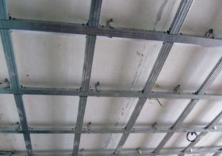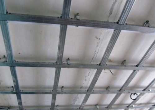 Le lattage profilé en placoplâtre est monté au plafond presque de la même manière que le processus d'installation du cadre sur les murs. Dans ce cas, la distance entre les attaches verticales doit être d'environ 0,6 m.