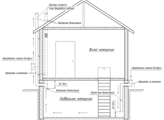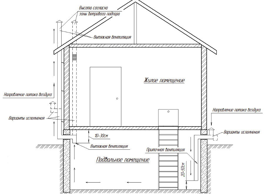 Dans les pièces ordinaires, l'air circule à travers les vannes des fenêtres et les évents. Il n'y a pas de fenêtres au sous-sol. Pour la ventilation de la cave, il est nécessaire d'installer des conduits d'air séparés pour les flux d'air entrant et sortant.