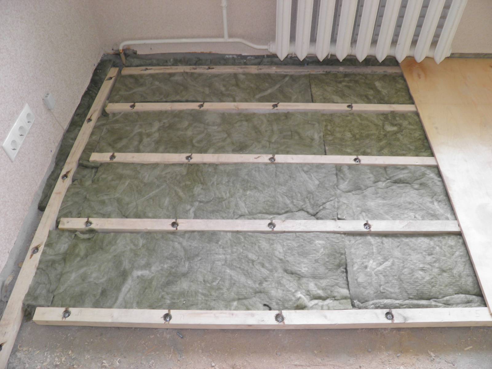 - Pose d'isolation. La distance entre les décalages varie de 25 à 50 cm.Pour renforcer la structure, des bandes transversales sont utilisées. Leur longueur est égale à la distance entre les décalages. L'isolant thermique peut maintenant être installé. Il peut s'agir d'argile expansée ou de laine de basalte. Dans le second cas, une étanchéité supplémentaire est nécessaire. Si des tapis en laine minérale sont utilisés comme isolant, les joints entre eux sont collés avec du ruban de construction.