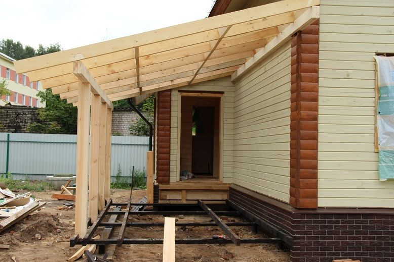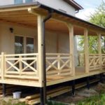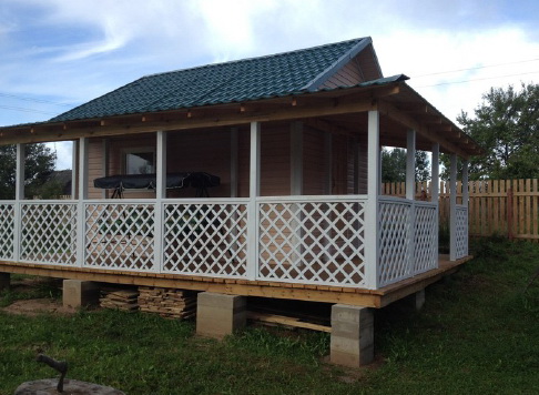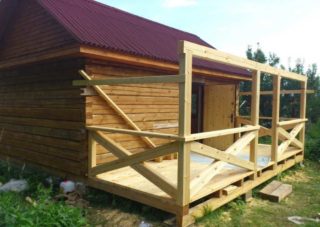 En l'absence de fonds suffisants pour la construction d'une véranda fermée, une option budgétaire peut être appliquée avec la perspective d'une nouvelle modernisation. Les fondations sont posées et des structures temporaires y sont installées à partir des matériaux restants après la construction de la maison - bois, tuyaux, planches, ardoise. Pour les premiers mois et même les années, un sol, une petite clôture et un toit suffiront. Si vous décorez la véranda avec goût, son design ascétique sera presque invisible.