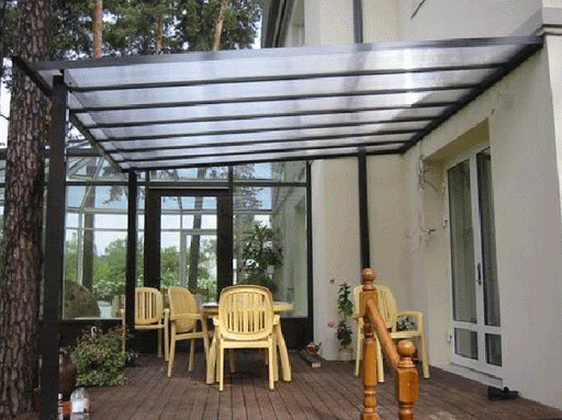 - Toit. Il peut être transparent (verre ou polycarbonate) et mat. Dans le second cas, l'ardoise, le feutre de toiture, l'onduline, les tuiles et les tôles profilées peuvent être utilisés. Le revêtement en fer doit être abandonné, car, avec sa facilité d'installation et son coût abordable, il fait un bruit très fort pendant la pluie.