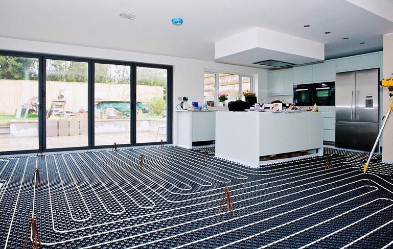 - Les tuyaux ne sont pas posés sur toute la surface de la pièce. Il doit y avoir des espaces sous les canapés et les meubles de rangement, à au moins 10 cm des murs.