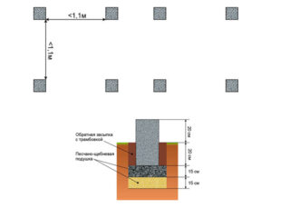 - Faire une base. Creusez des trous, remplissez-les et tassez un coussin de sable et de gravats sur leur fond. Abaissez ensuite les supports en eux. Il peut s'agir de pièces moulées en béton, de poteaux en briques, de pieux vissés, de tuyaux en fer ou en amiante-ciment. Avant l'immersion, les grilles en fer et en bois doivent être protégées de l'humidité. La hauteur par rapport au sol doit être d'au moins 10 cm.