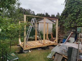- Installez le sol. Fixez d'abord le grillage le long des supports, puis posez les planches dessus. Il est préférable de les fixer avec des vis autotaraudeuses, de sorte que vous puissiez ensuite retirer librement des fragments du sol pour l'entretien et la réparation.