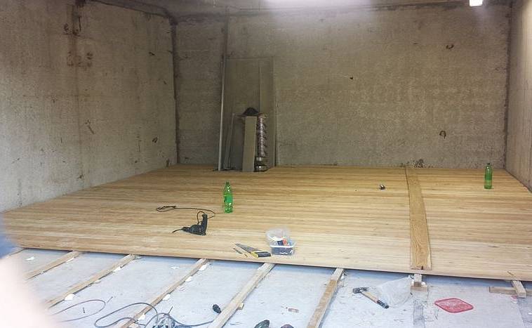 Si la base en béton ne diffère pas par de sérieuses différences de hauteur, il n'est pas nécessaire de monter les bûches. Les lames de parquet de grande épaisseur conviennent tout à fait. Avant la pose, ils sont traités à l'huile de lin et peints.