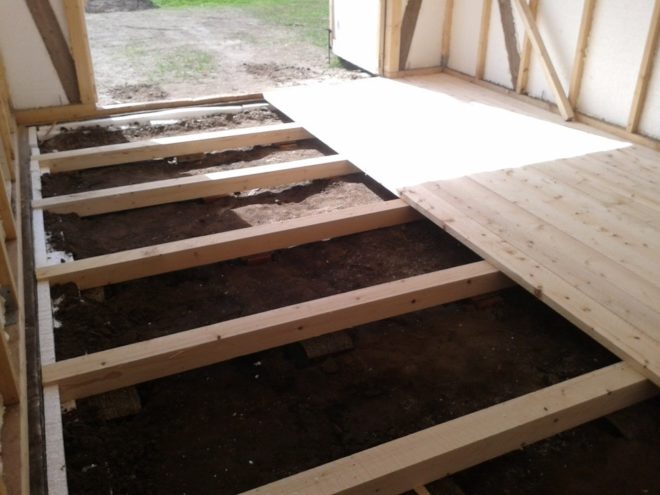 - Installation de décalage. Ce sont des poutres en bois qui soutiennent toute la structure du plancher. Installé sur des planches plates.