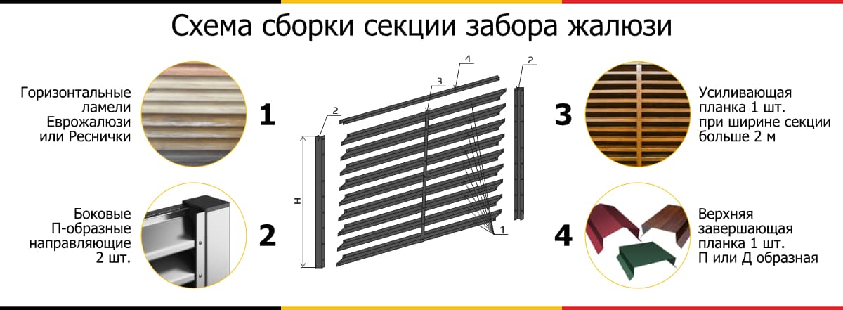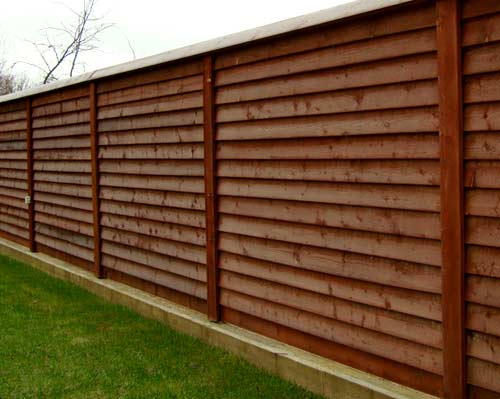 - Le remplissage de la clôture est représenté par des lamelles disposées horizontalement. Ils sont fixés à un certain angle pour assurer le passage de l'air.