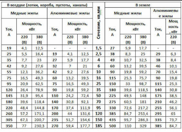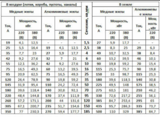 Les calculs de puissance ne sont pas effectués, mais des tableaux prêts à l'emploi sont utilisés, qui indiquent le rapport optimal de la section transversale des câbles en cuivre et en aluminium, en tenant compte de la tension et de la méthode d'installation. Pour un bain choisissez "câblage ouvert".