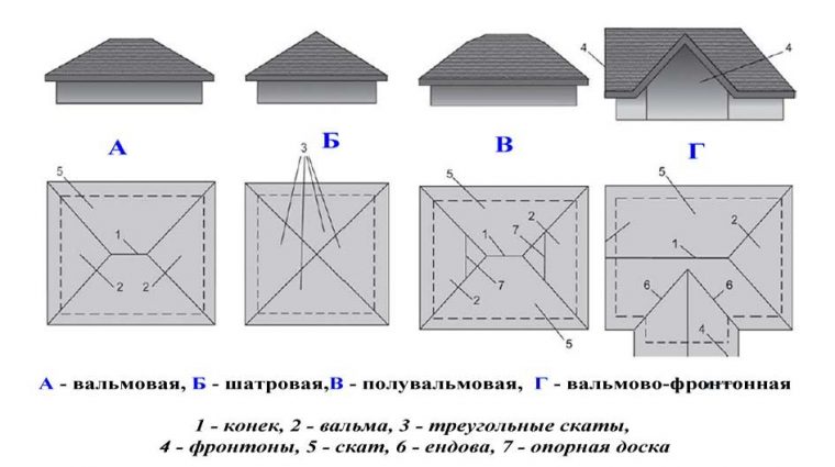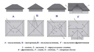 4, le toit en pente est structurellement quatre plans situés à un certain angle sur la dalle de plafond du bâtiment. Selon le type choisi ci-dessus, le toit ressemble à un rectangle ou à un carré. Un trait caractéristique est l'absence de frontons ou leur taille réduite par rapport aux homologues à pignon.