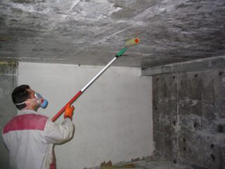 - Les surfaces sont préparées : nettoyées, parfois nivelées. Vous devez éliminer non seulement la saleté et la poussière, mais aussi les taches grasses, les traces de fuites, les traces de démoulage, etc. Si, après avoir enlevé les taches et le matériau avarié, des dépressions profondes subsistent, elles sont scellées avec du plâtre de ciment.