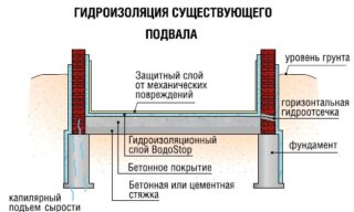 - Protection verticale des murs - réalisée si la nappe phréatique est très élevée et que l'eau pénètre dans le sous-sol par les murs, et pas seulement par le sol. Les murs doivent être imperméabilisés si un système de drainage n'est pas installé autour de la maison privée.