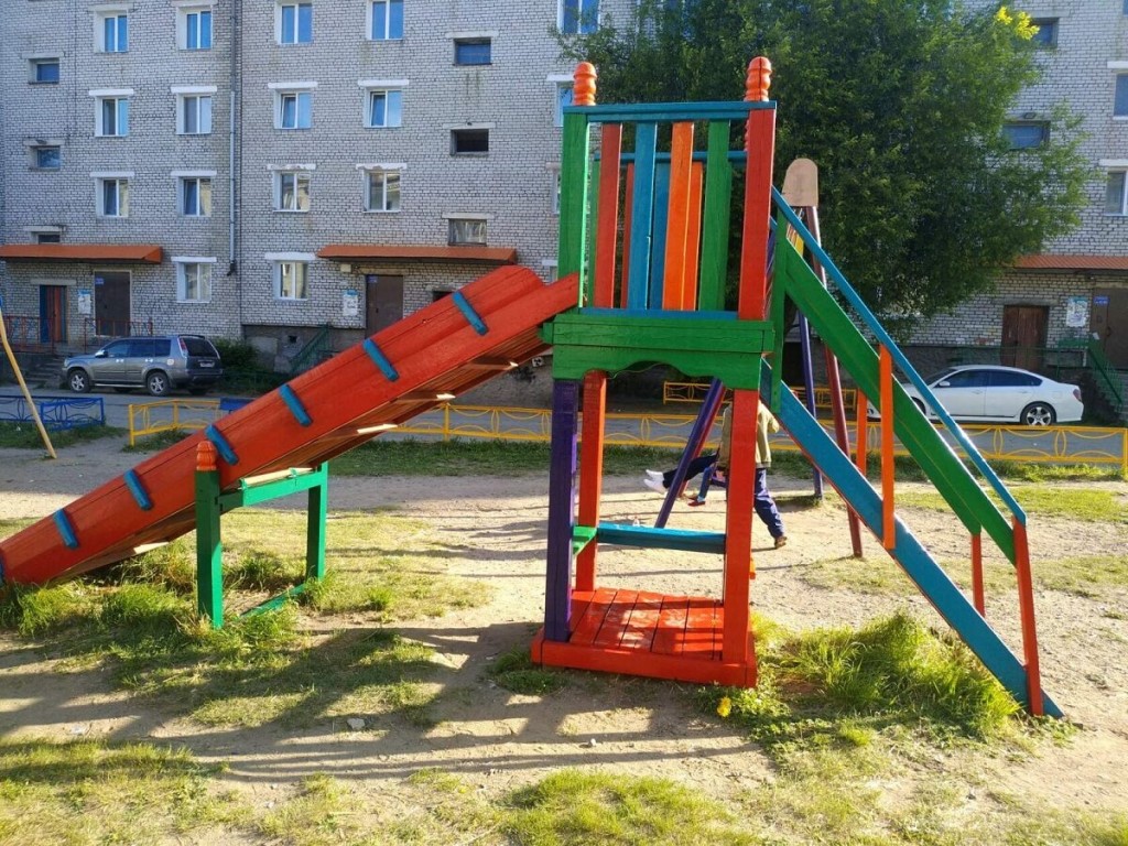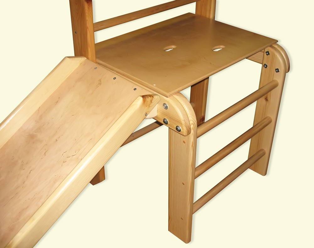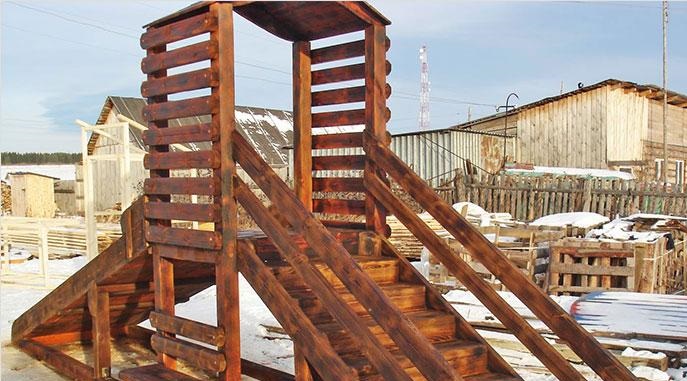 Les installations pour enfants sont peintes dans des couleurs vives et riches. Avant de peindre, l'arbre est apprêté, imprégné d'antiseptiques, de produits ignifuges contre le feu. Combinez plusieurs couleurs pour plus de couleur.