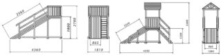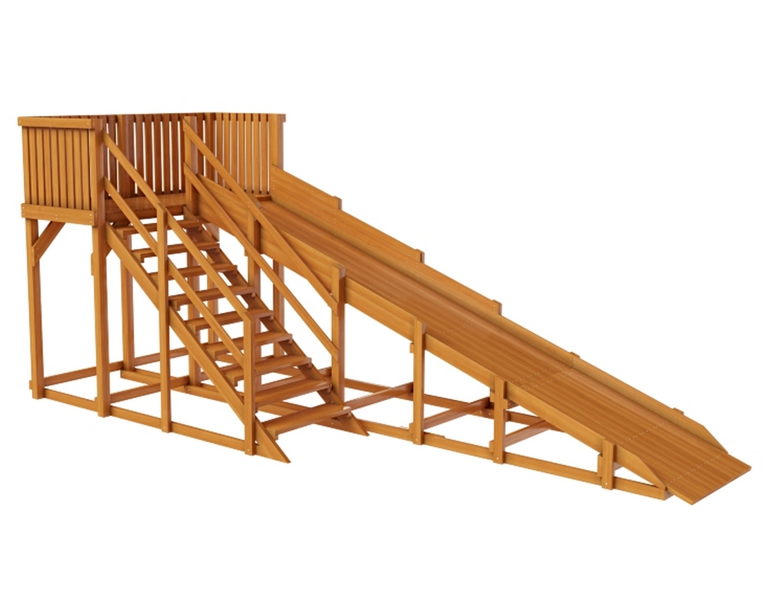 Les toboggans sont construits comme une structure séparée ou combinés avec des passages, des ponts. A l'étage, ils ont mis des superstructures en forme de fusée, une maison et des bâtiments fabuleux. L'escalier est droit, composé de deux parties avec un tour.