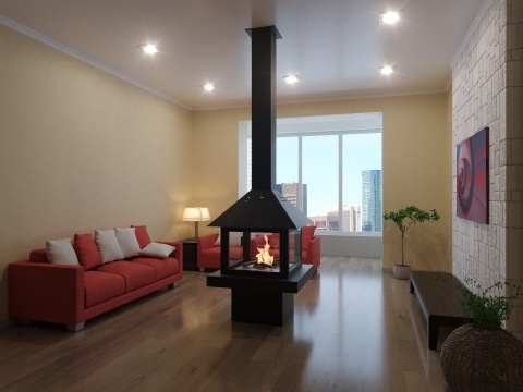 - Island - également une variante d'un gaz ou d'un biocheminée. Il est situé au centre de la pièce et est ouvert de tous les côtés. Il est souvent suspendu - fixé au plafond.
