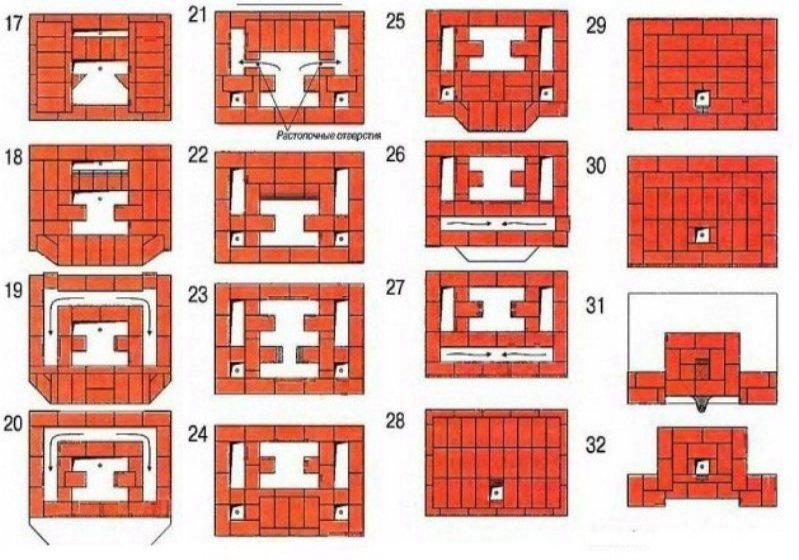 Le travail indépendant nécessitera une disposition pour la pose de briques dans chaque rangée. Ces dessins sont appelés commandes. La fumée à l'intérieur du foyer passe par un chemin difficile - en chauffant la surface, elle a tendance à sortir. Si les canaux sont mal repliés, le tirage disparaîtra et les gaz dégagés lors de la combustion s'écouleront dans la pièce.
