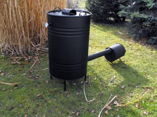Un baril de deux cents litres est utilisé, qui est installé en position verticale.Des perforations sont percées sur le côté sous forme de trous pour organiser le soufflage. Au fond, ils ont coupé une trappe carrée pour le bois de chauffage et mis une porte.