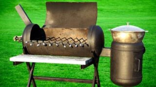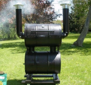 Le baril supérieur est considéré comme un fumoir (disposition verticale) et le bois de chauffage est brûlé dans le baril inférieur (horizontal). Ils ont mis des barres de grille dans la chambre de combustion, un ventilateur. Les roues sont souvent soudées à une telle structure pour se déplacer au sol.