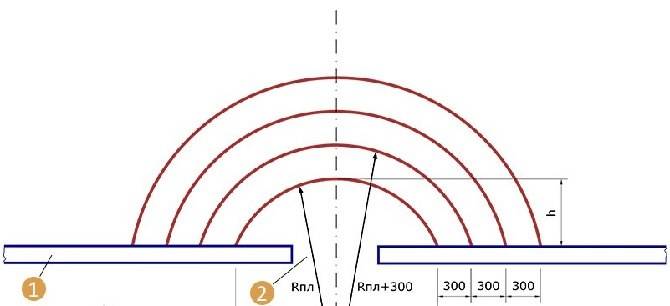 - Ensuite, ils commencent à calculer le rayon des marches, en tenant compte du fait que le demi-cercle supérieur doit être au moins 1 m plus large que la porte (50 cm de chaque côté).