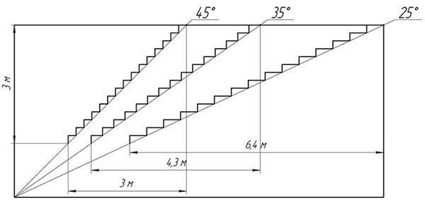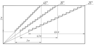 - L'angle d'inclinaison de la volée d'escalier doit être compris entre 25 et 45 °. L'option préférée est un angle d'inclinaison de 45 °, auquel l'échelle est la plus confortable et la plus sûre à utiliser. Cependant, dans de nombreux cas, l'angle d'inclinaison de l'escalier est pris égal à 25 et 35 °.