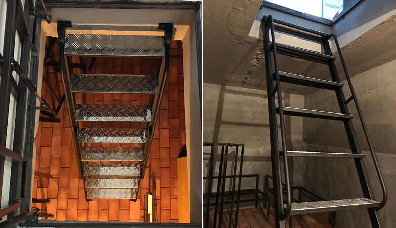 L'escalier menant au sous-sol est en métal à l'aide d'une machine à souder, vous devez donc pouvoir travailler avec. Les éléments métalliques sont traités avec un agent antirouille, peints avec de l'huile et des composés pentaphtaliques pour augmenter la résistance à la corrosion.