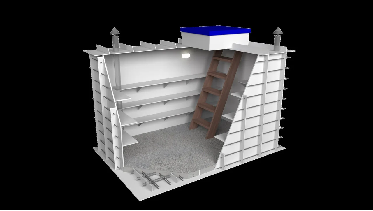 En contrebas, près de la marche, un espace est prévu pour descendre des marches et contourner la structure par l'autre côté, où se trouvent les légumes et les boîtes de nourriture. Un escalier en colimaçon peut être réalisé avec un poteau central auquel les marches sont fixées, ou plusieurs supports peuvent être réalisés en cercle.