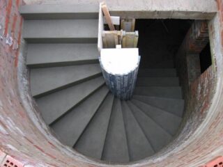 La conception ne nécessite pas beaucoup d'espace, elle est placée dans de petits sous-sols. Il n'est pas toujours pratique d'utiliser un escalier de ce type en raison de l'emplacement spécifique des marches et de leur forme. Des passerelles à vis sont placées au milieu du sous-sol ou à côté d'un des murs.