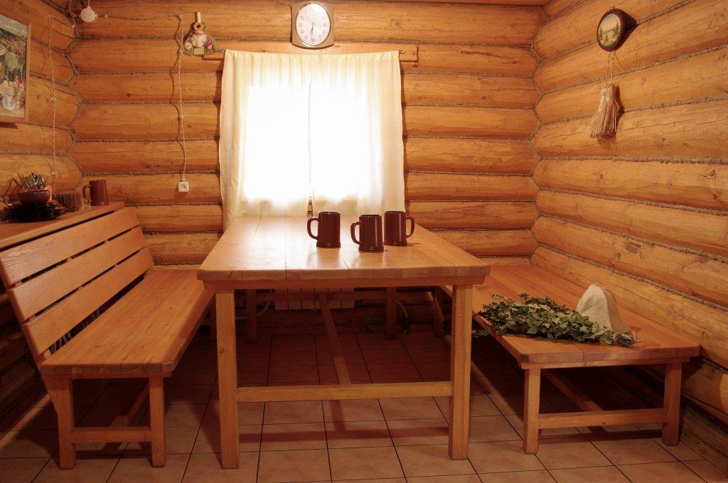 Une table et une chaise en bois sont placées dans la salle de récréation. Il est préférable de rendre un banc confortable - avec un dossier et des mains courantes latérales. Ils essaient de fabriquer des meubles à l'ancienne : rustique, rustique, style chalet. Il est préférable de mettre la table non pas sur des pieds droits, mais sur des pieds croisés et sur des supports. Souvent, les modèles sont décorés d'éléments métalliques décoratifs.