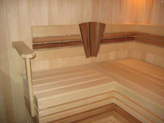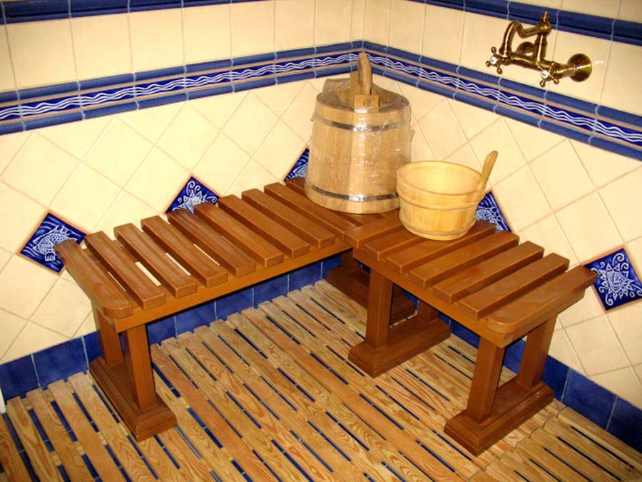 - Étagère - à un ou plusieurs étages. Linéaire, si placé le long d'un mur, en forme de L ou de U, si le long de plusieurs. Son dispositif est le même aussi bien dans le hammam que dans le sauna. Souvent, le kit est complété par un repose-pieds. L'étagère est fixée au mur. Ce meuble ne se transporte pas d'un endroit à l'autre.