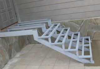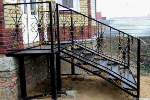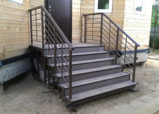 - Escaliers. Se compose de plusieurs niveaux s'il y a une différence de hauteur entre le sol et le premier niveau de la maison. La taille recommandée des marches métalliques pour le porche est de 27 à 32 cm de largeur, de 12 à 20 cm de hauteur et jusqu'à 5 cm de bande de roulement. La largeur minimale est de 60 cm, l'optimum est de 90-100. L'angle d'inclinaison varie entre 22 et 42 degrés, sur la base de cet indicateur, le nombre et les paramètres des marches sont déterminés. Pour plus de commodité et de sécurité, les escaliers métalliques du porche sont équipés de mains courantes, généralement du même matériau. La hauteur de la clôture est de 90-120 cm.
