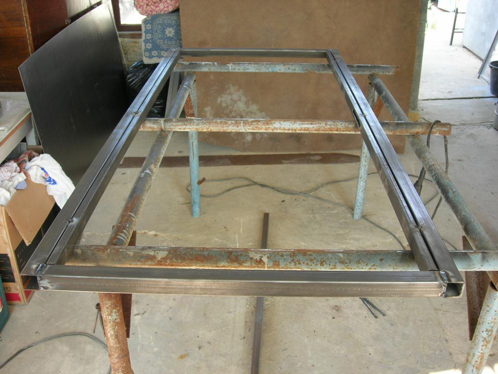Les charnières sont constituées de tiges d'acier d'un diamètre de 2 cm, tandis que l'entrée et la contrepartie d'un tuyau de section appropriée sont soudées simultanément au châssis et au caisson.