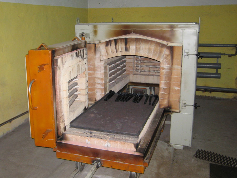 Selon le cycle de production, les fours sont allumés pendant un certain temps ou fonctionnent en continu avec remplacement périodique des moufles remplis.