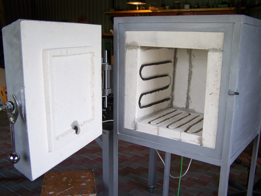 L'élément suivant sera l'installation de l'élément chauffant et du thermostat (capteurs de l'unité de contrôle). Deux brûleurs à gaz ou éléments électriques sont fixés au corps du four. Les brûleurs sont installés par le bas et par le haut. Les résistances électriques sont fixes en fonction de leur configuration. Le fil est enroulé en spirale, les NUANCES sont placées sur les côtés, et si vous avez besoin d'une chaleur de 1500°C et plus, alors sur le sol et la voûte. Le terrain est fourni à coup sûr afin d'exclure le choc du salarié.Les appareils de chauffage sont ensuite fermés avec un boîtier en acier, dans lequel un trou est fait pour une vanne d'air.