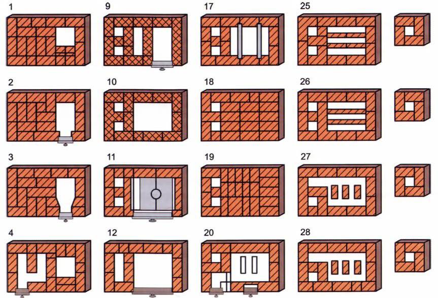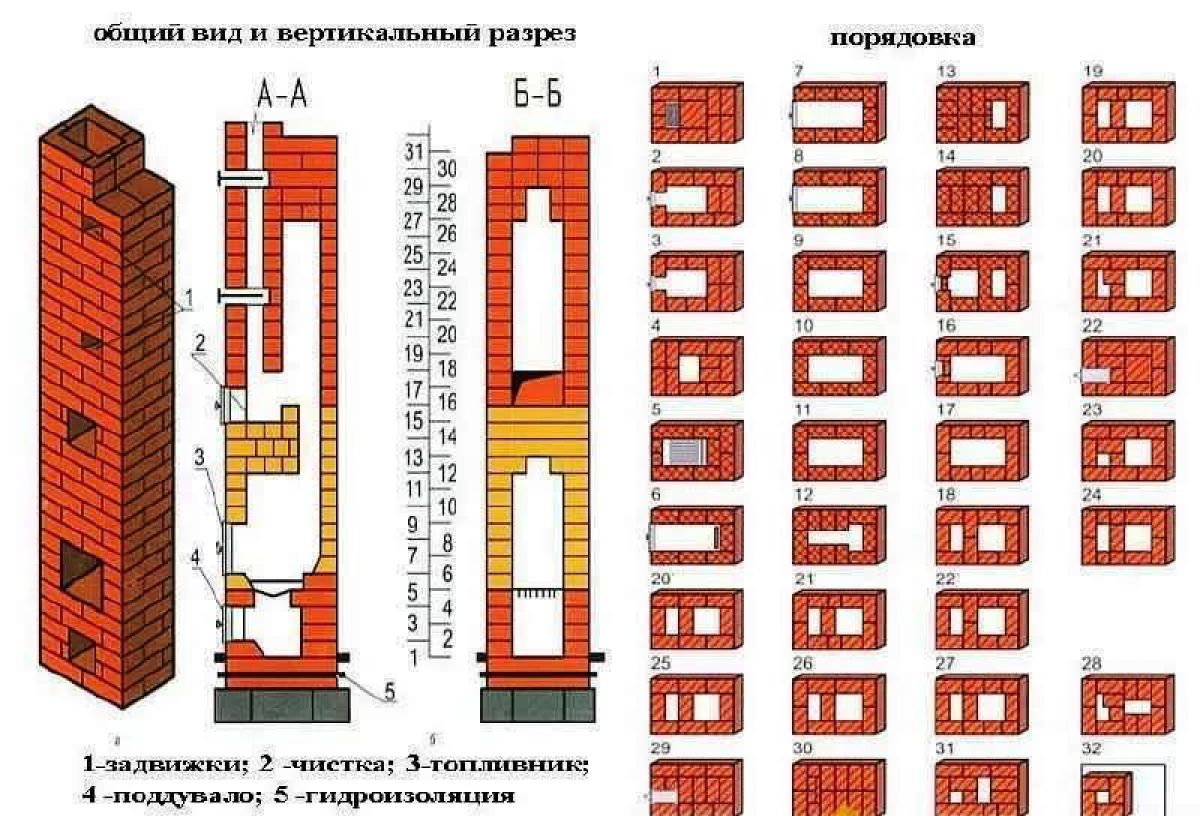 Si la cheminée est également disposée, il faut 56 pièces par mètre linéaire de hauteur. L'argile a besoin de 30 kg et le ciment de 70 kg par 100 pièces.