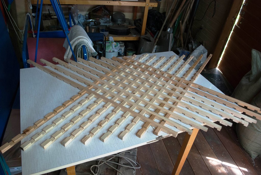 Un treillis à sections rectangulaires est plus facile à fabriquer que les cellules diagonales, mais cette dernière option semble plus rentable. Chaque coupe est traitée avec du papier de verre de manière à niveler uniquement la surface, mais pas à réduire la taille de la pièce.
