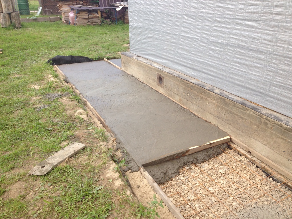 - Couler du béton. Pour le travail, il vaut mieux utiliser la marque M200. Quelques heures après la fin des travaux, la zone aveugle doit être recouverte d'un film afin que le béton ne perde pas d'humidité trop rapidement. La chape doit être humidifiée pendant deux semaines.